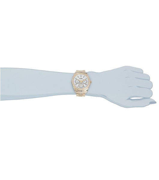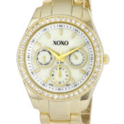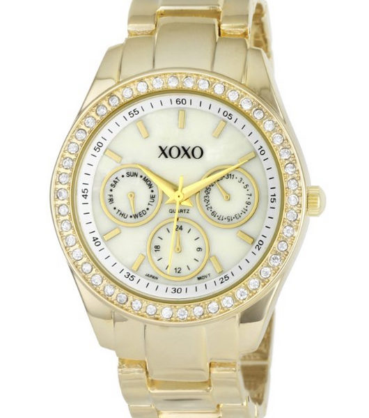 Xoxo creates contemporary chic in a women’s gold tone watch with a sleek bracelet band. The lovely MOP face with clear rhinestone accented bezel and seconds track circling the inner perimeter houses gold tone hands and markers. Stylishly sophisticated! ****Features**** * Stainless Steel Case Back * Striking Gold Tone Bracelet Band * Analog with Gold Tone Hands & Markers * Lovely Round MOP Face with Clear Rhinestone Bezel * Seconds Track Around Inner Perimeter * Gold Tone Second Hand * Three Decorative Sub Dials * Japanese Quartz Movement * Mineral Crystal * Guanranteed 100% Authentic XOXO Watch ****Watch Stats**** [FACE] * Style: Analog * Shape: Round * Size: 38mm / 1-1/2 * Color: Mother of Pearl * Hands: GoldTone Swords * Hour Markers: Gold Tone Dashes * Misc: MOP FaceGold Tone Second HandClear Rhinestone Bezel [BAND] * Material: Metal * WristSize: up to 7-1/4″ * Width: 18mm / 3/4″ * Color: Gold * Clasp: Jewelry Clasp * Misc: “