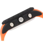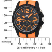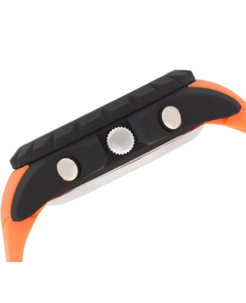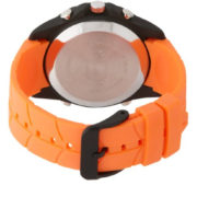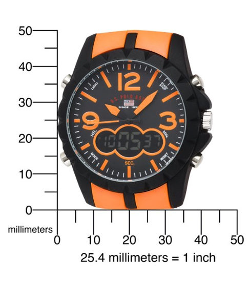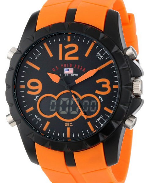 The U.S. Polo Assn. Men’s Analog-Digital Black Dial Orange Rubber Strap Watch features black round case, black dial with dual time display (analog and digital) which is easy to read. The case surrounds a sporty black dial, which is protected by a hardened mineral crystal and features orange markers, orange index and Arabic numeral hour markers, along with orange hands powered by Japanese quartz movement. The dial also features a stopwatch, timer and EL backlight. An orange silicone rubber band straps this watch to the wrist, while a black-toned buckle clasp ensures its secure placement. A flashy watch with vivid orange color, this watch demands attention.